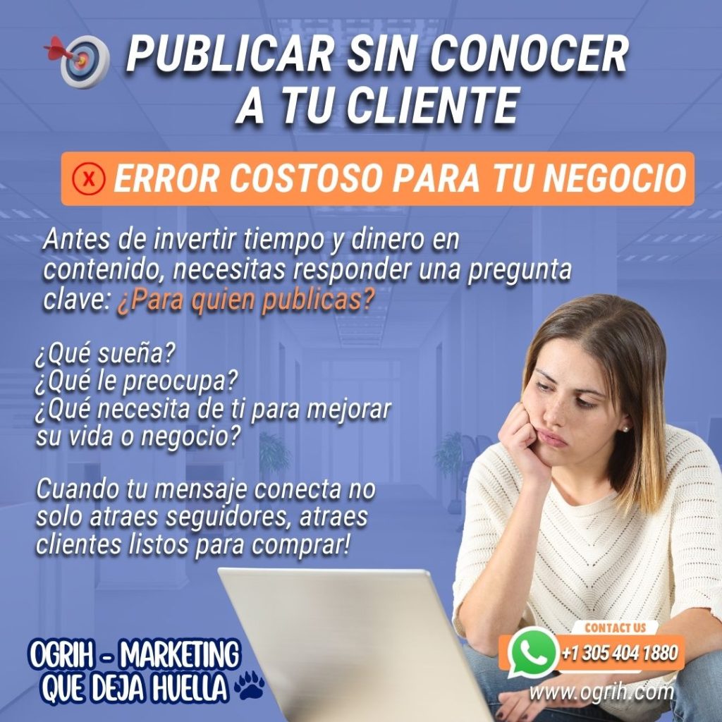 Introducción En el mundo digital, cada publicación que haces habla de tu negocio. Pero la gran pregunta es: ¿le hablas a quien realmente importa? Muchos emprendedores y dueños de negocios cometen el error de publicar contenido sin antes definir a quién va dirigido. El resultado: likes vacíos, seguidores que no compran y campañas publicitarias que